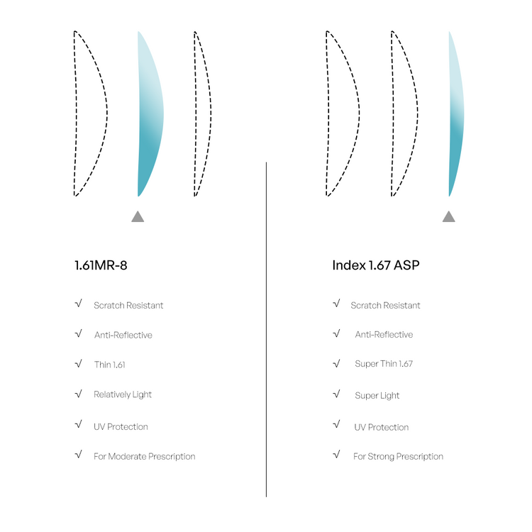 1.67 ASP:The ultra-slim, lightweight option designed for stronger prescriptions to reduce edge thickness.Both come with our premium anti-scratch and anti-reflective coatings
